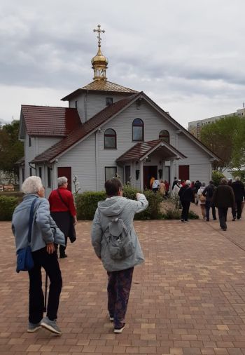 Um 12.30 Uhr ging es weiter zur Russisch Orthodoxen Kirche n der Allee der Kosmonauten. Hier gedachten wir des 1700jährigen Jubiläums des 1. Ökumenischen Konzils und des dort formulierten Nicänischen Glaubensbekenntnisses, das uns Christen bis heute miteinander verbindet.Die beiden Priester der Gemeinde Piotr Pochalkow und Evgeny Murzin sowie der Diakon Dmitrij Krasnikov und drei Chormitglieder erfreuten uns mit ihren Ostergesängen.