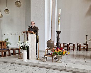 Pater Steenken berichtet uns von dem Wunder des Baus der Kirche hier an der Landsberger Allee, wo sie doch ursprünglich am Stadtrand ihren Platz finden sollte. Er erläuterte die Ausgestaltung der Kirche und erzählte von der wechselvollen Geschichte des Kruzifix im Altarraum.
