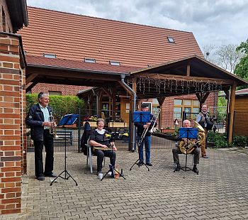 Auf dem Gemeindehof wurden wir von vier Mitgliedern des Posaunenchores begrüßt und sangen "Wir stehen im Morgen. Aus Gott ein Schein durchblitzt alle Gräber... Erstanden ist Christus. Ein Tanz setzt ein." - Seit 1500 Jahren gibt es in diesem Jahr unsere christliche Jahreszählung. Das war hier unser Thema, an das wir erinnert wurden.